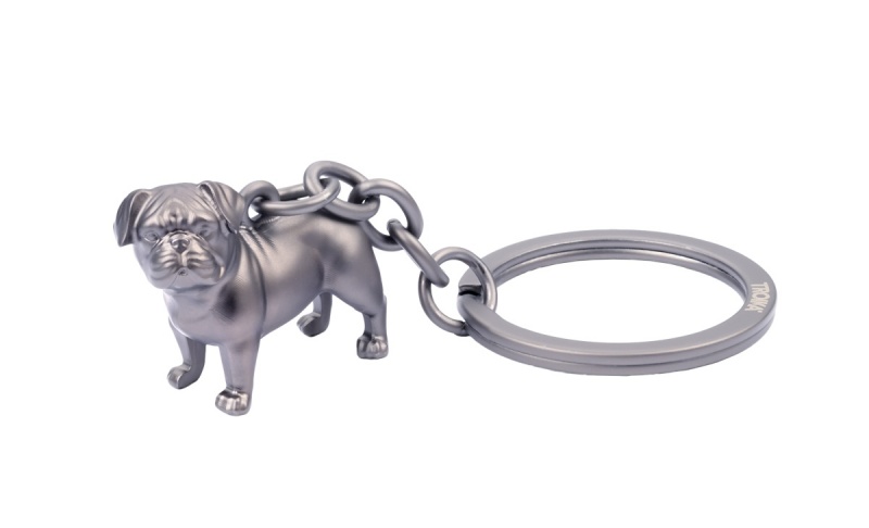 3D brelok w kształcie mopsa – matowe, szare wykończenie z odlewu metalu