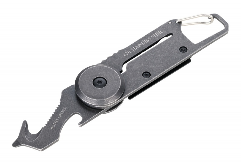 posiada 5 funkcji: nóż do otwierania paczek, karabińczyk, mały brzeszczot, śrubokręt płaski, otwieracz do butelek
