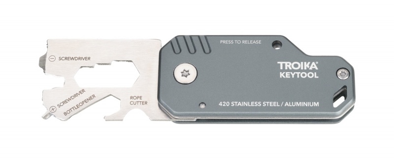 kompaktowe narzędzie z 11 funkcjami: nóż, przecinak do linek, otwieracz do butelek, klucz sześciokątny (4 rozmiary), śrubokręt krzyżakowy, śrubokręt płaski, pętla z drutu jako brelok na klucze