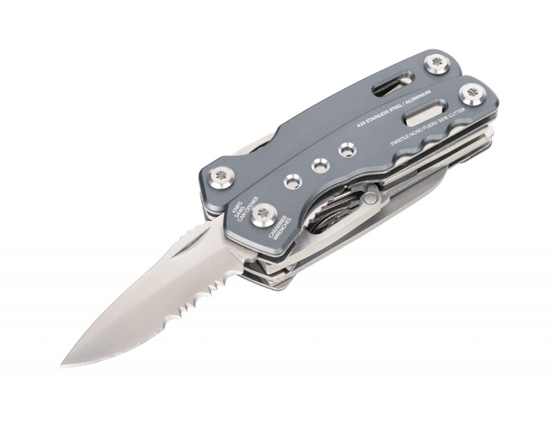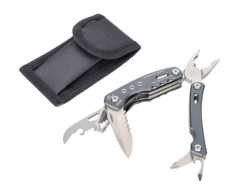 narzędzie wielofunkcyjne do zastosowań outdoorowych i majsterkowania, zintegrowana sprężyna i funkcja blokady 15 funkcji: szczypce wydłużone, szczypce klasyczne, obcinacz boczny, nóż, piła, śrubokręt płaski, otwieracz do puszek, pilnik, karabińczyk, otwieracz do butelek, klucz sześciokątny wszystkie narzędzia dostępne z zewnątrz po złożeniu, szybki dostęp w każdej sytuacji solidna konstrukcja ze stali nierdzewnej 420 i aluminium, matowe wykończenie w kolorze szarym ergonomiczny kształt i wytrzymałe materiały zapewniają komfort i trwałość w zestawie nylonowe etui z pętlą na pasek, praktyczne i wygodne w podróży karabińczyk umożliwia przypięcie do plecaka lub szlufki od spodni, idealny towarzysz każdej przygody kolor: szary